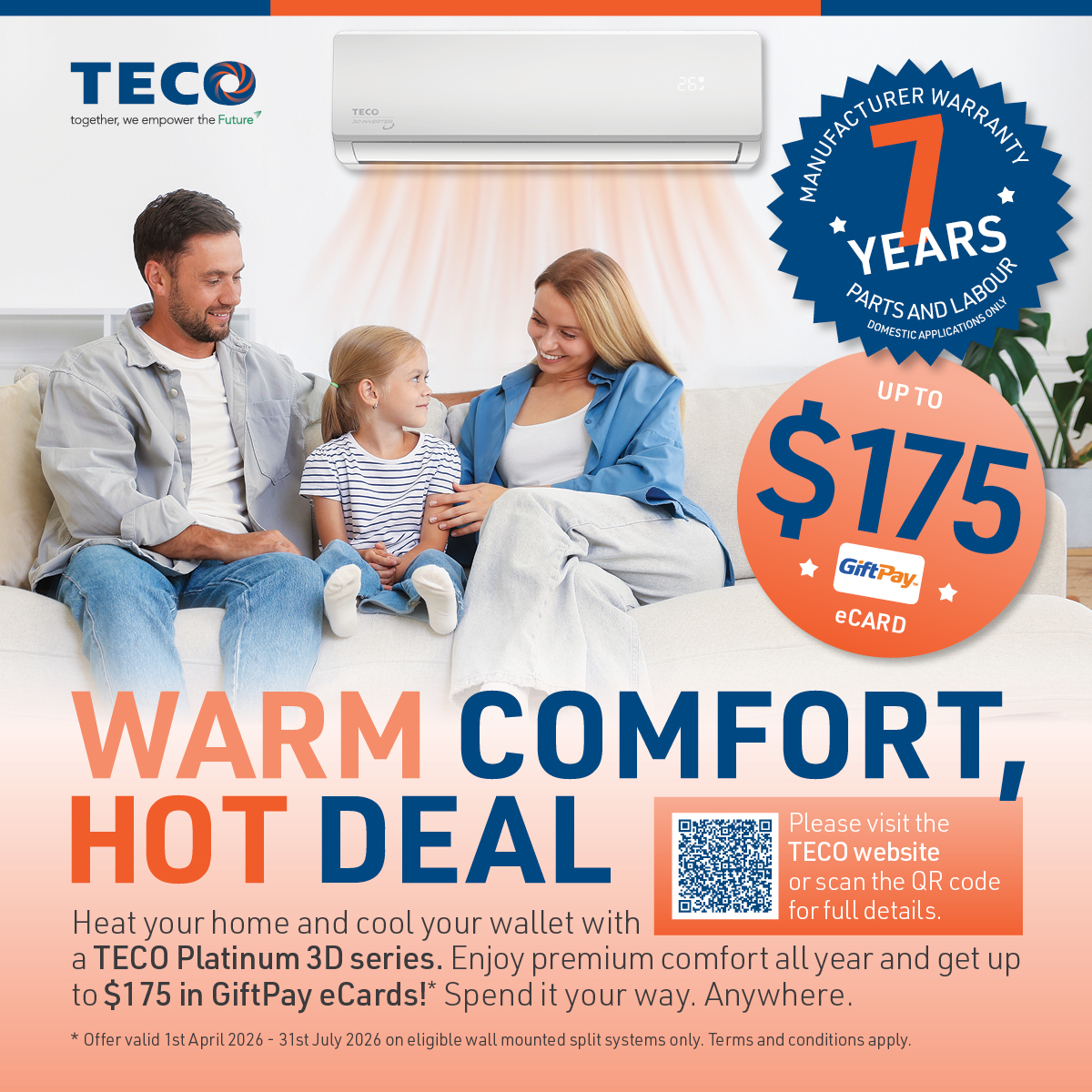 When you purchase a participating TECO Platinum 3D Split System, you will be rewarded with a GiftPay™ eCard valued up to $175 — to spend at your preferred retailer.